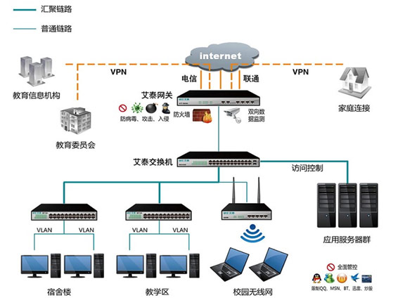 "科教興國(guó)"是保證我國(guó)能夠長(zhǎng)期、穩(wěn)定、高速發(fā)展的戰(zhàn)略國(guó)策,教育信息化是達(dá)成該戰(zhàn)略國(guó)策的重要手段之一,因此教育信息化工作受到了國(guó)家各級(jí)教育主管部門(mén)的高度重視。但是實(shí)際情況是經(jīng)費(fèi)朝大學(xué)傾斜,因此,如何利用比較少的資源實(shí)現(xiàn)中小學(xué)的信息化,這是我們關(guān)注的重點(diǎn),況且,中小學(xué)作為基礎(chǔ)教育的階段,更是需要普及信息化。網(wǎng)絡(luò)給教育帶來(lái)的好處不言而喻。艾泰科技提供一套安全、穩(wěn)定、“綠色”的網(wǎng)絡(luò)解決方案。