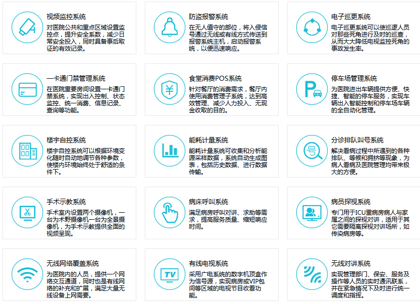 本解決方案包括:綜合布線系統(tǒng)、安全防護系統(tǒng)、網(wǎng)絡服務系統(tǒng)、出入人員探視安全管理和排隊呼叫、病房呼叫等系統(tǒng)組成。