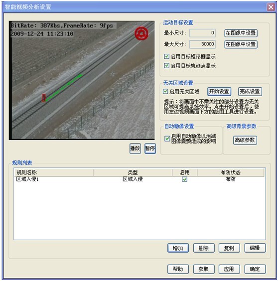 同時(shí),鐵路上防止人或動(dòng)物在鐵軌區(qū)逗留,要求必須能具備智能分析的越界、進(jìn)入及徘徊功能的檢測(cè)。